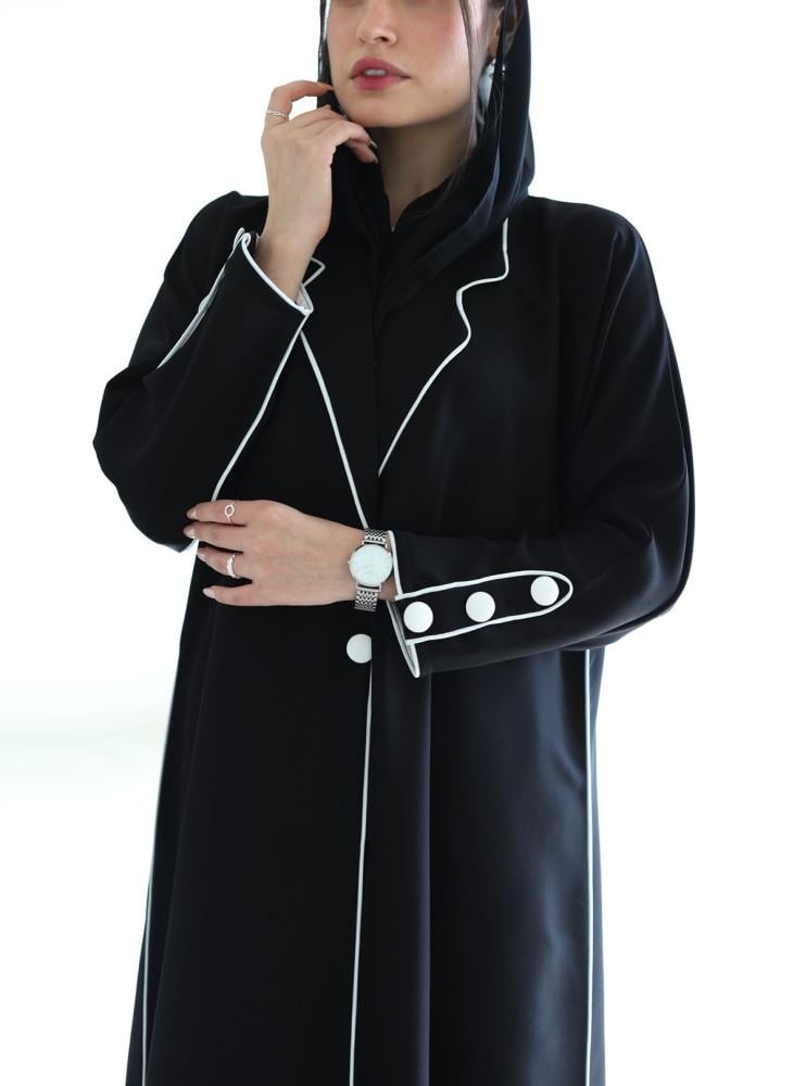 تداخل اللون الابيض مع الاسود يضفى تناغم نعومة ورقي فى اطلالتك الرسمية والعملة ، كما جاءت عباية البارو من قماش كريب فاخر عالي الجودة ،مع قصة نص كلوش مريحة : ومقفولة بأزرار بيضاء انيقة ، وتناسب اطلالتك في اللقاءات الرسمية وايضا عملية فى السفر والتنقل .