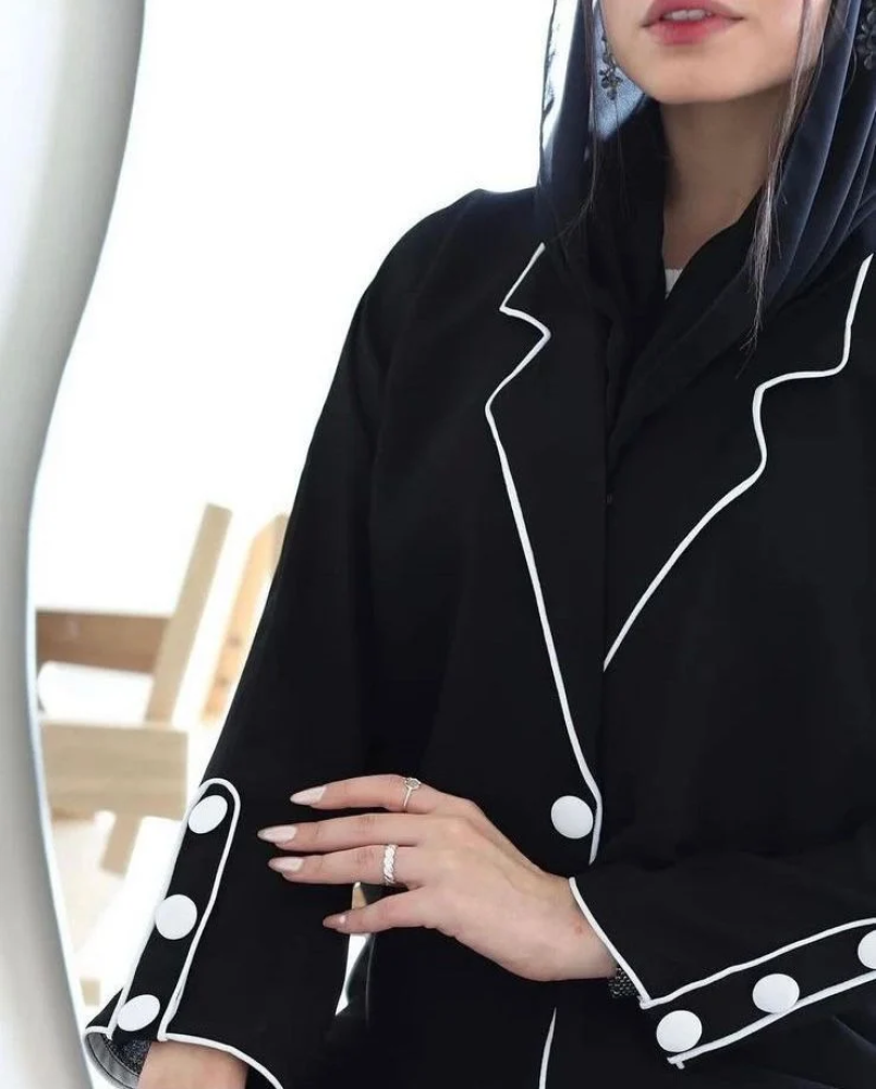 - كما تميزت العباية بإضافة أزرار بيضاء علي الأكمام والعباية تضفي تباينًا جذابًا يبرز جمال التصميم.