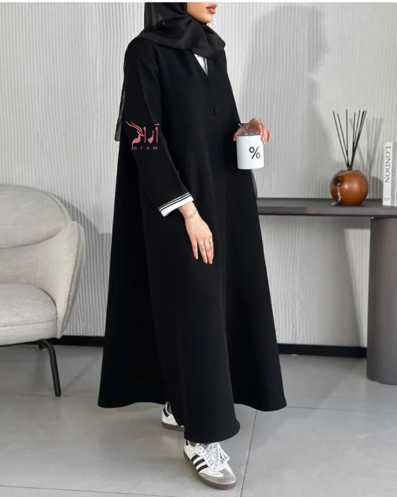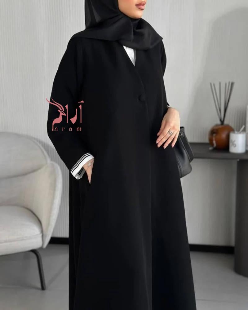 - عباية ارام تتسم بتصميم أسود كلاسيكي يناسب كافة الإطلالات والمناسبات.